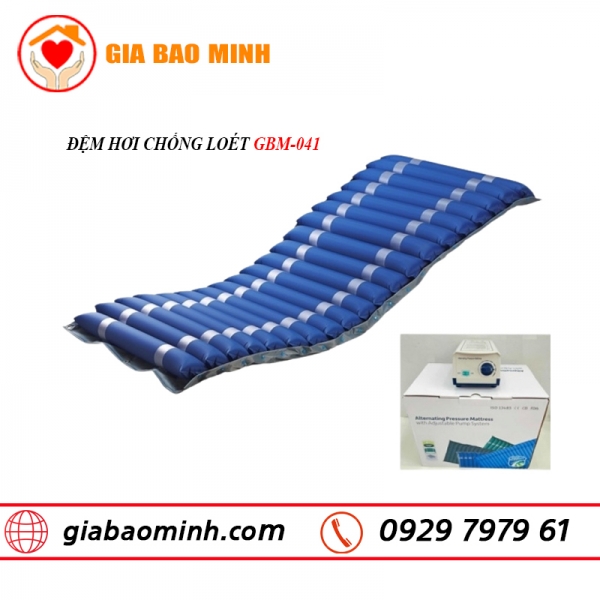 - Đệm hơi GBM-039 chống loét tốt hơn loại đệm hơi có múi hơi hình quả trám thông thường. Đệm hơi có múi hình quả trám thì múi hơi rất mỏng chỉ khoảng 3cm nên khi nằm lâu vẫn cần phải hỗ trợ để trở mình chống loét. Đối với đệm chống loét GBM-041 ống hơi ngang, đường kính ống hơi là 10 cm nên chống loét tuyệt đối không cần trở mình. Nếu người bệnh đã có hiện tượng loét thì nên dùng loại đệm này và kết hợp với chữa loét sau đó vết loét sẽ không còn tái phát: Ống hơi dày 10 cm nên vùng lưng được thả lỏng tốt hơn khi đệm đảo hơi, hình thức đảo hơi có 3 cách đó là: ống căng-ống xịt, ống xịt-ống căng và tất cả đều căng. Đệm sẽ chạy tự động để chống loét không cần sự can thiệp của con người. Chu kỳ đảo hơi là 12 phút/ 1 chu kỳ