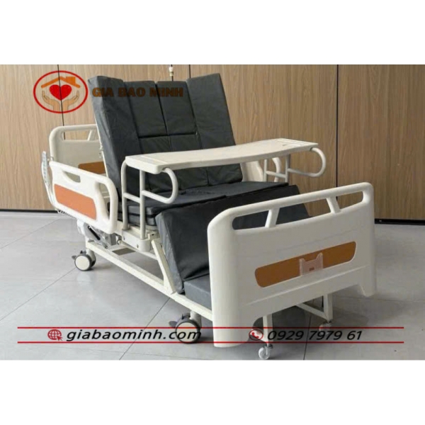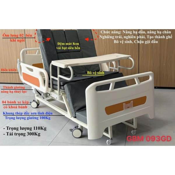 Giường điện đa năng 093GD giúp chăm sóc bệnh nhân tiện lợi và an toàn với các chức năng: nâng đầu – nâng chân, nghiêng trái phải, có bô vệ sinh, bàn ăn, chậu gội đầu. Thiết kế khung thép sơn tĩnh điện, tải trọng 300kg, động cơ êm ái – bền bỉ theo thời gian.