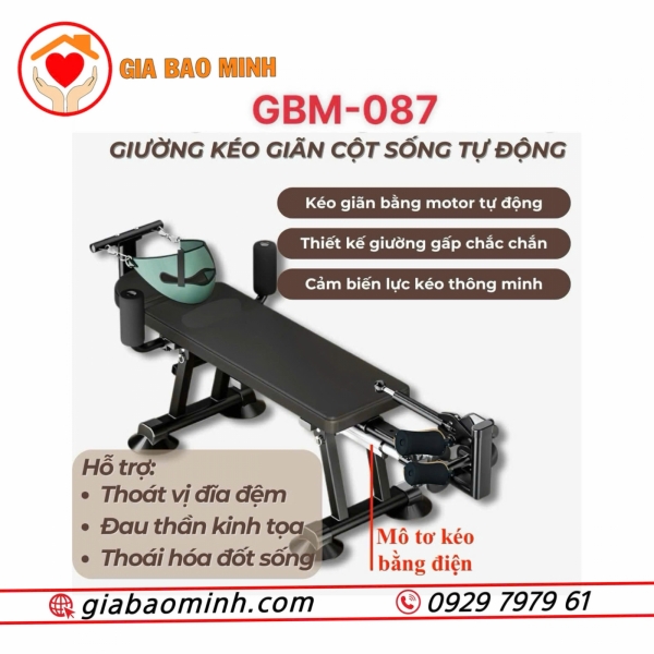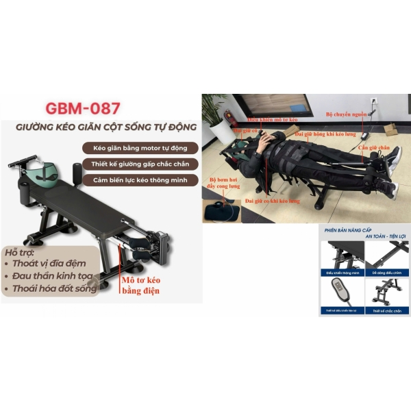 Giường kéo giãn cột sống tự động GBM-087 là thiết bị hỗ trợ điều trị đau lưng, thoát vị đĩa đệm, thoái hóa cột sống, đau thần kinh tọa một cách hiệu quả và an toàn.
