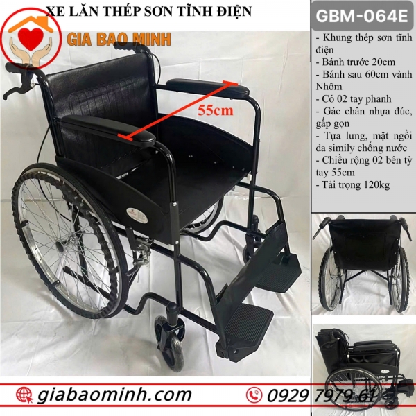 Xe lăn thép sơn tĩnh điện GBM-064E là dòng xe lăn phổ thông, chắc chắn và bền bỉ, phù hợp sử dụng cho người già, người khuyết tật, người bệnh sau phẫu thuật hoặc cần hỗ trợ di chuyển trong sinh hoạt hằng ngày.